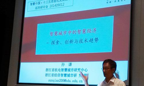 當然,最重要的是杭州,杭州我剛才介紹了它的背景,基本上我概括一下叫智慧的產(chǎn)業(yè)化,把這些我們認為有可能是智慧產(chǎn)業(yè)或是智慧經(jīng)濟的,要形成杭州乃至全國乃至國際中心;第二,產(chǎn)業(yè)的智慧化主要是通過兩化融合智慧化的改造等等,把原有的產(chǎn)業(yè)通過信息化的采用增加它的價值、提高它的智慧,當然杭州打造“六大中心”的目標是培育萬億級智慧經(jīng)濟和服務產(chǎn)業(yè);