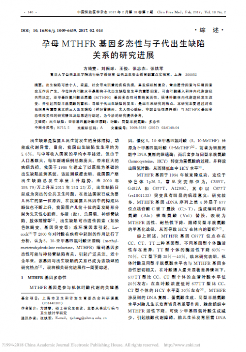該研究項(xiàng)目成果論文——《上海地區(qū)孕婦MTHFR C677T基因多態(tài)性與血漿同型半胱氨酸水平的關(guān)聯(lián)性分析》已收錄于《中華疾病控制雜志2017年7月第21卷第7期》、論文——《孕母MTHFR基因多態(tài)性與子代出生缺陷關(guān)系的研究進(jìn)展》收錄于《中國預(yù)防醫(yī)學(xué)雜志2017年2月第18卷第2期》。