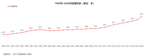 《報(bào)告》提到,從1990年開(kāi)始,我國(guó)初婚年齡不斷推遲,2020年我國(guó)的平均初婚年齡28.7歲,比1990年的平均初婚年齡22.9歲推遲了5.8歲;其中近十年初婚年齡推遲速度明顯加快,這可能是由于隨著90后步入婚戀市場(chǎng)后,他們?cè)诿媾R更長(zhǎng)受教育年限,以及更大生活壓力的同時(shí),思想觀念也不斷發(fā)生變化,所以出現(xiàn)了明顯的初婚年齡推遲。