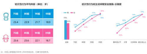 同樣顯著降低的還有“初次性 行為”平均年齡?!秷?bào)告》顯示,“70后”男性為23.4歲,女性為23.6歲。隨后呈現(xiàn)逐漸走低的態(tài)勢(shì)。至“00后(18歲以上人群)”,已降至男性平均18.9歲,女性平均18.7歲。然而,雖然平均年齡在下降,但是人群整體“性安全意識(shí)”卻在不斷提升。在“初次性行為時(shí)主動(dòng)采取安全措施”的選項(xiàng)上,男性“70后”最低,為59%。隨即逐漸上升,至“00后”已達(dá)78%。而女性的自我保護(hù)意識(shí)則更加明顯,從“70后”的53%,大幅升至“00后”的80%,并且直接超越了男性占比。