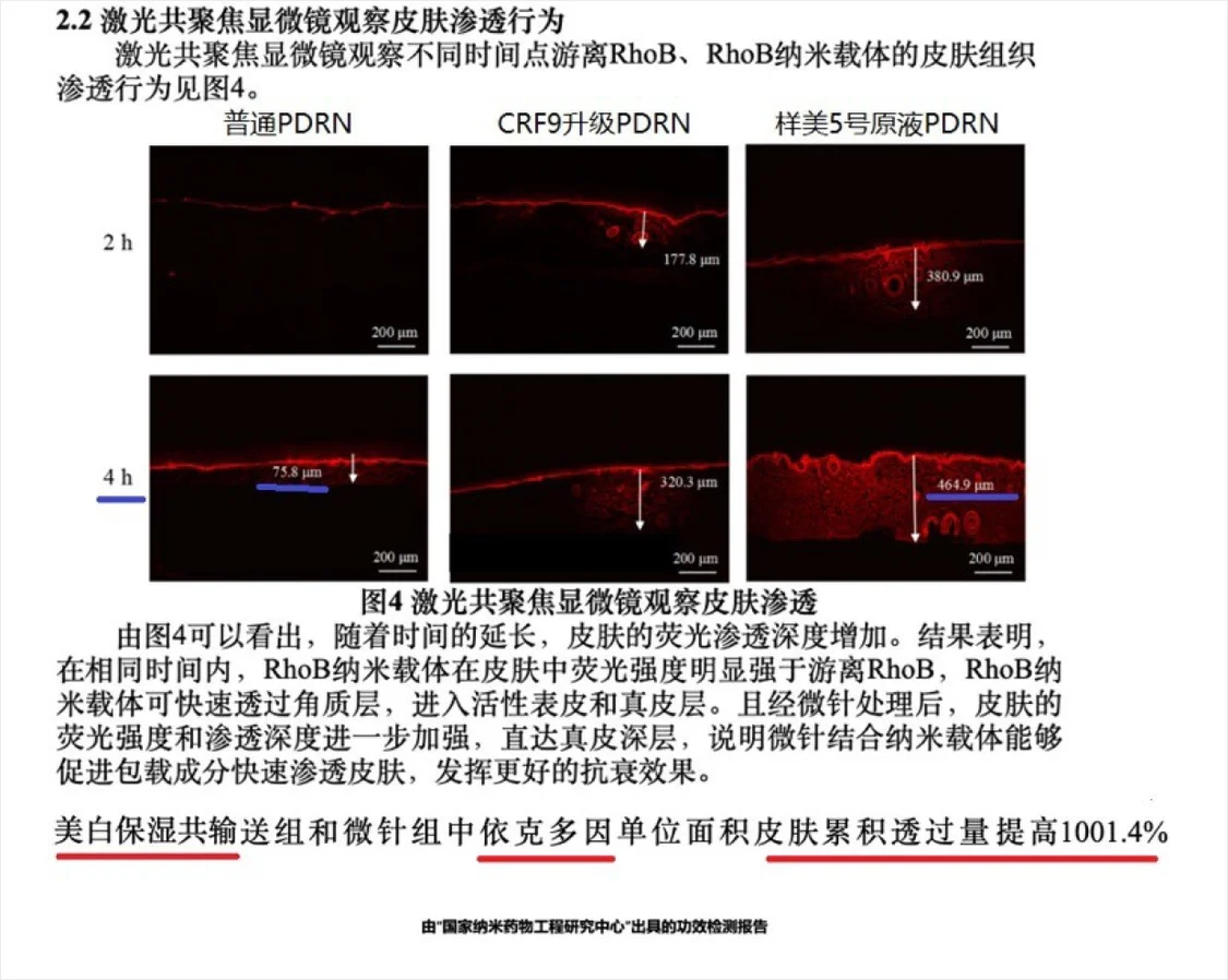 從我國(guó)權(quán) 威機(jī)構(gòu)的實(shí)驗(yàn)檢測(cè)結(jié)果上可以看到,使用4小時(shí)以后,普通的三文魚原料滲透只有75微米大概在淺皮層,而被CRF9技術(shù)平臺(tái)升級(jí)過(guò)的PDRN可以深達(dá)464微米,直接進(jìn)入了真皮深層,深入到細(xì)胞內(nèi)。