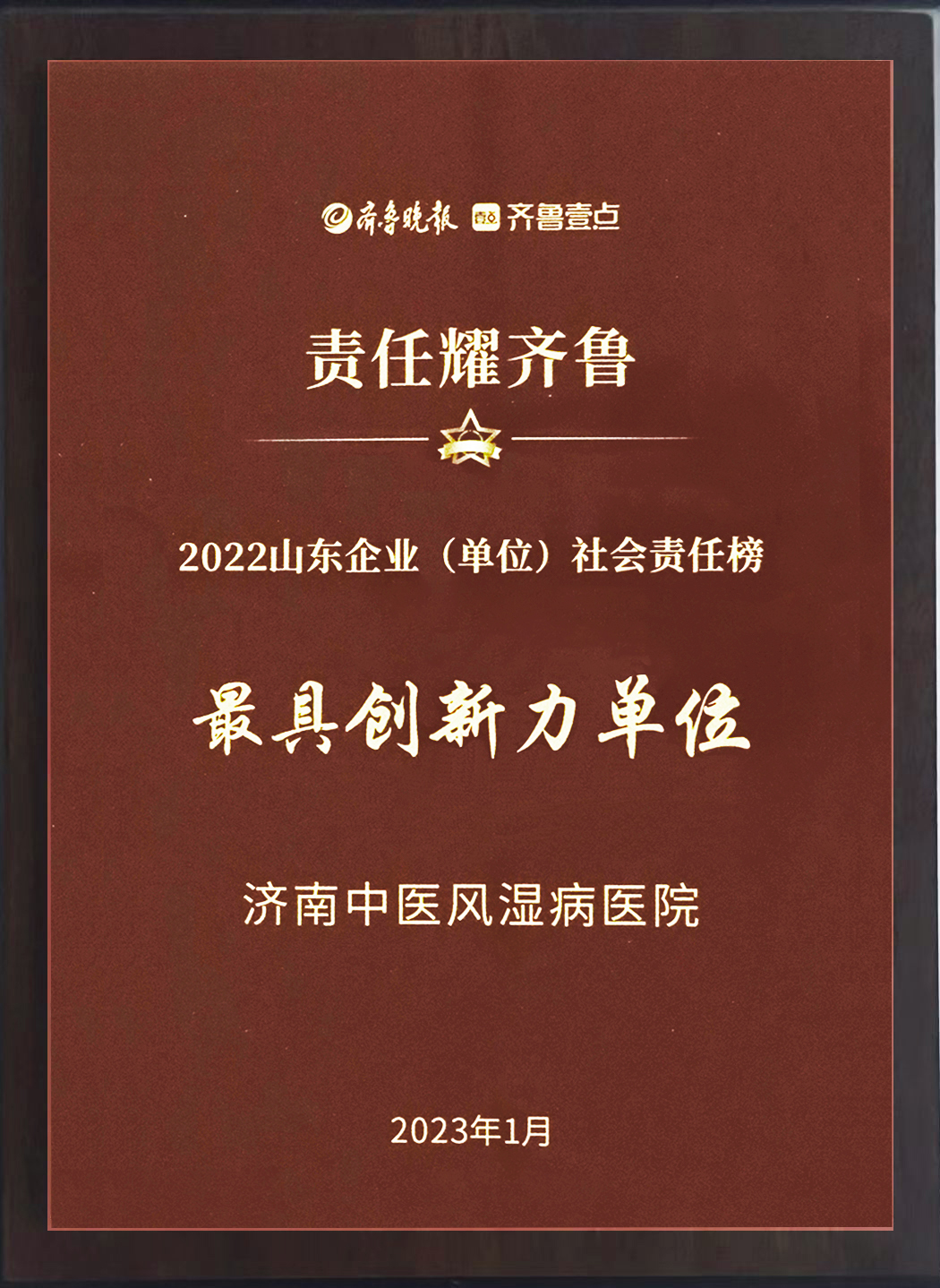 本次活動(dòng)由山東省衛(wèi)生健康委員會(huì)指導(dǎo),齊魯晚報(bào)·齊魯壹點(diǎn)主辦,山東省衛(wèi)生健康委員會(huì)醫(yī)療管理服務(wù)中心、山東省醫(yī)師協(xié)會(huì)特別支持。我院榮獲“責(zé)任耀齊魯”2022山東企業(yè)(單位)社會(huì)責(zé)任榜“最具創(chuàng)新力單位”榮譽(yù)稱(chēng)號(hào)。