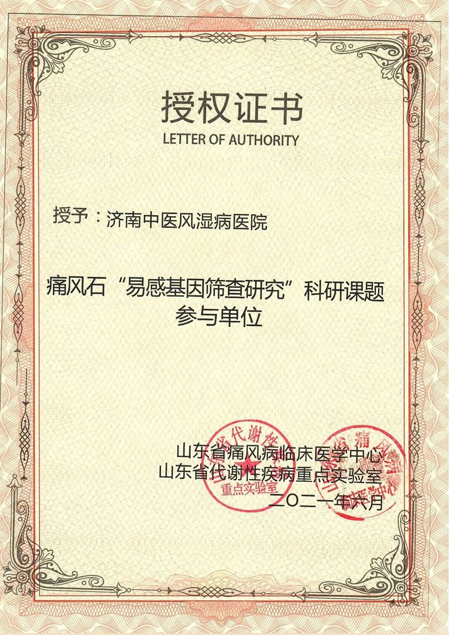 談及創(chuàng)新力,濟(jì)南中醫(yī)風(fēng)濕病醫(yī)院一直致力于高尿酸血癥的臨床研究及患者的規(guī)范診治,由于在高尿酸血癥領(lǐng)域的不懈努力,成為亞太痛風(fēng)聯(lián)盟高尿酸血癥及痛風(fēng)管理中心的一員,成立了亞太痛風(fēng)聯(lián)盟高尿酸血癥及痛風(fēng)管理中心濟(jì)南中醫(yī)風(fēng)濕病醫(yī)院分中心,成為濟(jì)南市區(qū)分中心,榮獲“痛風(fēng)石易感基因篩查研究”科研課題參與單位。