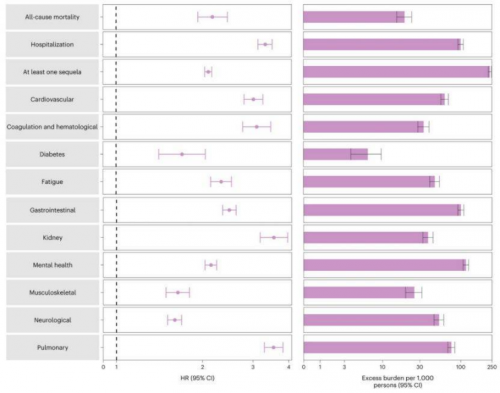 具體而言,與感染一次相比,復(fù)陽(yáng)后罹患肺病的可能性高出3.5倍,患心臟病的可能性高出3倍,腦部疾病風(fēng)險(xiǎn)增加1.6倍,總體死亡風(fēng)險(xiǎn)高出一倍!