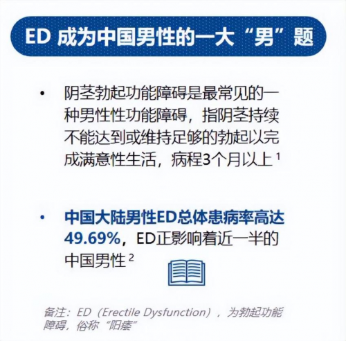 數據表明,超過四成男性存在健康問題和困擾,其中性健康問題更是當代男性的三大困擾之一。值得注意的是,勃 起功能障礙(Erectile Dysfunction,簡稱ED)作為最常見的性 健康問題,由于沒有得到科學規(guī)范的及時治療,正在不斷威脅廣大男性的健康,并進一步給家庭生活和社會經濟造成負擔。