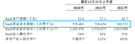 對比客戶增長情況,銷售額的增長困境更加凸顯。2022年比2021年客戶數(shù)增長了1.26萬名,同比增長38.1%,但同期SaaS產(chǎn)品流水總額僅增加了2427.9萬,增長3.3%。