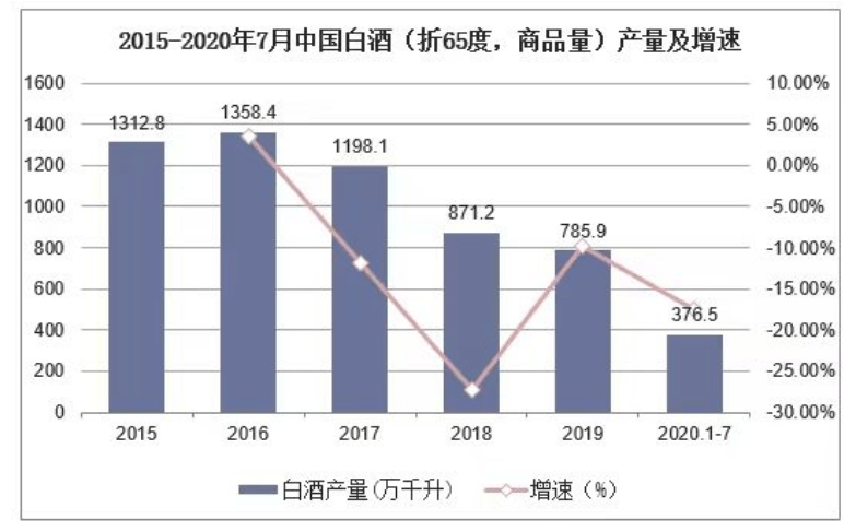 醬香型白酒三種工藝對(duì)比資料來(lái)源:公開(kāi)資料整理二、醬香酒行業(yè)發(fā)展現(xiàn)狀白酒產(chǎn)量方面,近年來(lái),我國(guó)白酒產(chǎn)量整體呈下降趨勢(shì),據(jù)國(guó)家統(tǒng)計(jì)局?jǐn)?shù)據(jù)顯示,2019年中國(guó)白酒(折65度,商品量)產(chǎn)量為785.9萬(wàn)千升,同比下降9.79%,2020年1-7月,我國(guó)白酒產(chǎn)量?jī)H有376.5萬(wàn)千升,同比下降17.45%。2015-2020年7月中國(guó)白酒(折65度,商品量)產(chǎn)量及增速資料來(lái)源:國(guó)家統(tǒng)計(jì)局,華經(jīng)產(chǎn)業(yè)研究院整理醬香型白酒已成為名副其實(shí)的‘黃金產(chǎn)業(yè)’。