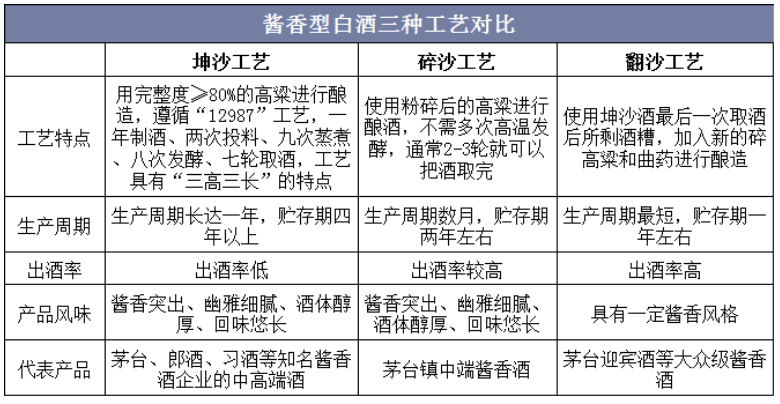 白酒香型分類資料來(lái)源:鳳凰網(wǎng),華經(jīng)產(chǎn)業(yè)研究院整理醬香型白酒工藝可以細(xì)分為坤沙、碎沙、翻沙三種,其中坤沙最具代表性。坤沙醬香酒工藝講究“三高三長(zhǎng)”:“三高”即高溫制曲、高溫堆積發(fā)酵、高溫餾酒,“三長(zhǎng)”即基酒生產(chǎn)周期長(zhǎng)、大曲貯存時(shí)間長(zhǎng)、基酒酒齡長(zhǎng)?!叭呷L(zhǎng)”工藝對(duì)釀酒原料、釀造時(shí)間、當(dāng)?shù)貧夂蛱卣鞯葪l件有著極高的要求,因此優(yōu)質(zhì)醬香酒產(chǎn)區(qū)被嚴(yán)格限制在赤水河流域。且“三高三長(zhǎng)”工藝賦予了醬香酒獨(dú)特的風(fēng)味,飲后不口干、不易上頭,符合消費(fèi)者“少喝酒、喝好酒”的健康追求?!叭呷L(zhǎng)”工藝一方面賦予了醬香酒稀缺性,另一方面使醬香酒形成獨(dú)特的風(fēng)味,從而打造了醬香酒的獨(dú)特競(jìng)爭(zhēng)力。