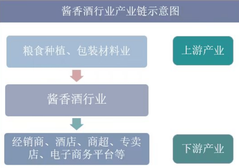 醬香型白酒行業(yè)的產(chǎn)業(yè)鏈上游主要是包裝材料行業(yè)和糧食種植業(yè);下游行業(yè)是批發(fā)與零售業(yè),主要通過(guò)經(jīng)銷商、酒店、商超、專賣店、電子商務(wù)平臺(tái)等渠道最終銷售到消費(fèi)者手中。