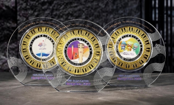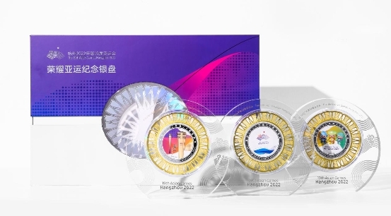 杭州第19屆亞運(yùn)會紀(jì)念銀盤共3枚,選取本屆亞運(yùn)會核心圖形作為設(shè)計(jì)元素,采用精密浮雕及高清彩印工藝,結(jié)合非遺花絲打造而成。三枚銀盤采用足銀聚寶盤造型,分別以杭州第19屆亞運(yùn)會會徽“潮涌”;吉祥物“琮琮”“宸宸”“蓮蓮”和亞運(yùn)會火炬“薪火”為主元素,設(shè)計(jì)新穎,采用造幣工藝和非遺花絲相結(jié)合,限量發(fā)行5000套。