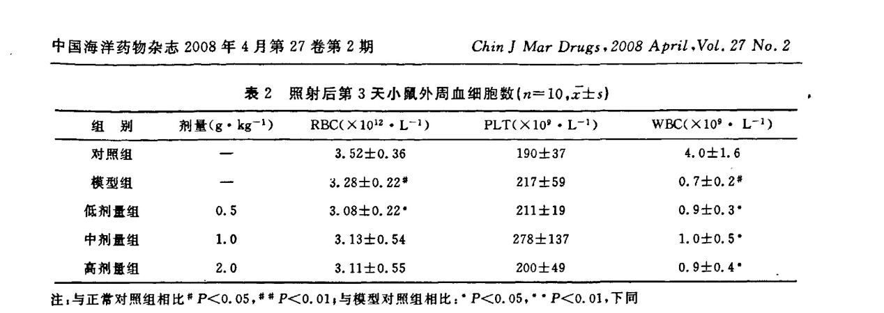 海洋星蟲(chóng)多糖處理后外周血紅細(xì)胞、血小板計(jì)數(shù)及血細(xì)胞比容、血紅蛋白水平、SOD活性均顯著升高,白細(xì)胞有升高趨勢(shì),MDA含量明顯下降,骨髓DNA含量顯著升高,而肝臟指數(shù)、脾臟指數(shù)、胸腺指數(shù)均無(wú)明顯變化。此實(shí)驗(yàn)結(jié)果表明:海洋星蟲(chóng)多糖對(duì)有害環(huán)境因素復(fù)合損傷大鼠具有升高白細(xì)胞、血小板,提高抗氧化能力,促進(jìn)骨髓損傷修復(fù)等保護(hù)作用(摘自《解放軍醫(yī)學(xué)雜志》2012年10月1日 第37卷第10期)