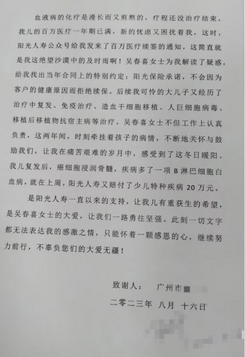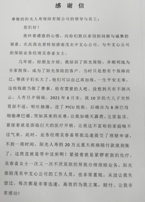 獲取病案資料后,工作人員再次協(xié)助梁女士提交少兒特定疾病的理賠申請,不到一個工作日,20萬元理賠金便順利支付至梁女士賬戶。在收到這份“意料之外”的理賠金后,梁女士特地從北京寄來了感謝信及錦旗,她說:“是陽光人壽一直以來的支持,讓我兒有重獲新生的希望,是陽光透過業(yè)務(wù)人員傳來的大愛,讓我們一路勇往前行。此刻一切文字都無法表達我的感激之情!”