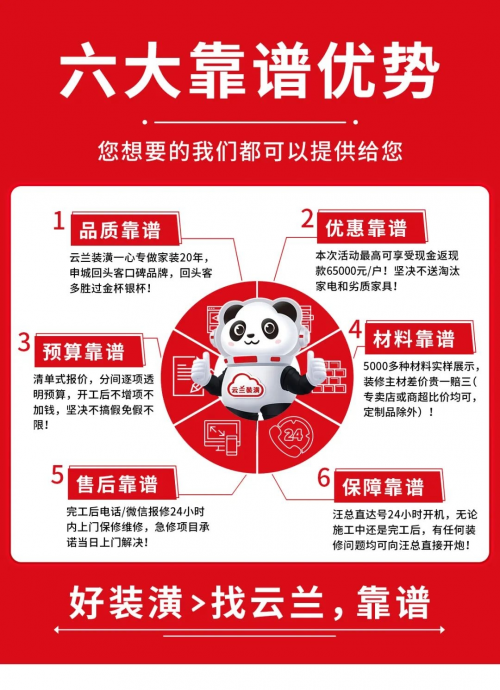 云蘭裝潢“20周年慶,5000萬(wàn)返現(xiàn)暨汪總簽贈(zèng)大狂歡”靠譜家裝節(jié),是您家裝的不二之選。讓我們一起歡慶中秋、國(guó)慶佳節(jié),共享家裝的快樂(lè)!趕緊撥打4000873339報(bào)名吧,讓我們一起開(kāi)啟這場(chǎng)靠譜的家裝盛宴!