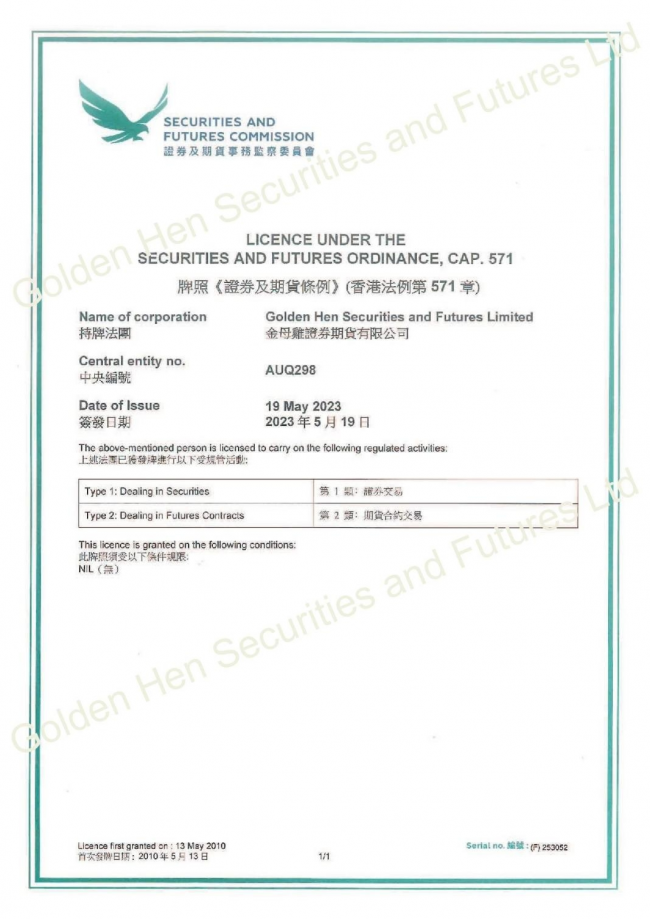 2023年5月19日,金母雞科技集團(tuán)旗下金母雞證券期貨有限公司經(jīng)香港證監(jiān)會(huì)批準(zhǔn),正式獲發(fā)第1號(hào)“證券交易”牌照,第2號(hào)“期貨合約交易”牌照!