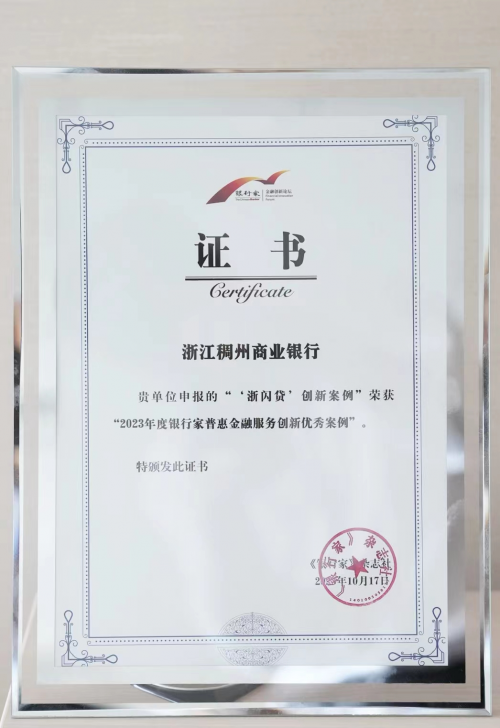 浙江稠州商業(yè)銀行(下稱“稠州銀行”)的普惠金融服務(wù)案例——“浙閃貸”在數(shù)字金融和普惠金融領(lǐng)域勇于創(chuàng)新,貢獻(xiàn)突出,被列為“2023 銀行家金融創(chuàng)新成果”,在由《銀行家》雜志及銀行家金融創(chuàng)新論壇組委會主辦的“銀行家金融創(chuàng)新論壇暨銀行家金融創(chuàng)新成果發(fā)布會”上,獲評“普惠金融服務(wù)創(chuàng)新優(yōu)秀案例”。