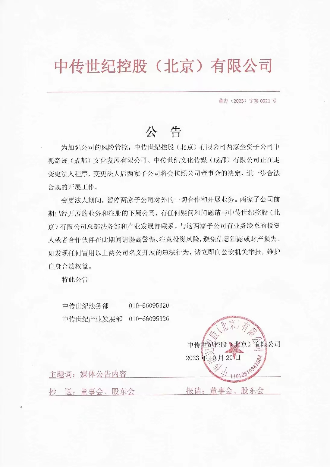 變更法人期間,暫停兩家子公司對(duì)外的一切合作和開展業(yè)務(wù)。兩家子公司前期已經(jīng)開展的業(yè)務(wù)和注冊(cè)的下屬公司,有任何疑問和問題請(qǐng)與中傳世紀(jì)控股(北京)有限公司總部法務(wù)部和產(chǎn)業(yè)發(fā)展部聯(lián)系。與這兩家子公司有業(yè)務(wù)聯(lián)系的投資人或者合作伙伴在此期間請(qǐng)?zhí)岣呔琛⒆⒁馔顿Y風(fēng)險(xiǎn),避免信息泄露或財(cái)產(chǎn)損失。如發(fā)現(xiàn)任何冒用以上兩公司名義開展的違 法行為,請(qǐng)立即向公安機(jī)關(guān)舉報(bào),維護(hù)自身合法權(quán)益。
