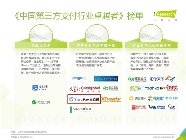 這次,艾瑞咨詢聯(lián)合第三方支付行業(yè)內(nèi)專家共同提名,從“合規(guī)安全、技術(shù)服務(wù)、產(chǎn)品創(chuàng)新”三方面核心能力出發(fā),綜合考量行業(yè)內(nèi)各類服務(wù)商的自身定 位,評選出行業(yè)中表現(xiàn)出色的案例。其中,Yiwu Pay義支付就成功入選成功《2023年中國第三方支付行業(yè)研究報告》典型案例,被評為中國第三方支付行業(yè)卓越者。