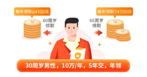 以30周歲男性投保福滿滿2號養(yǎng)老年金險,年交保費(fèi)10萬,交5年為例,該消費(fèi)者規(guī)劃從60周歲起開始按年領(lǐng)取養(yǎng)老金,每年可以領(lǐng)取64,100元;若想延后幾年,從65周歲再開始領(lǐng)取,則每年可以領(lǐng)取74,700元,在同等繳費(fèi)條件下,消費(fèi)者起始領(lǐng)取年齡越晚,可領(lǐng)取的養(yǎng)老金金額就越高。