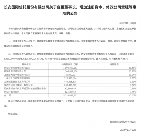 隨后,長(zhǎng)安信托在10月底完成章程修訂,11月完成了所有的變更手續(xù),并在官網(wǎng)發(fā)布公告。