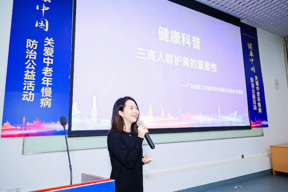 活動(dòng)上,來自廣東省第二中醫(yī)院腎內(nèi)科副主任醫(yī)師曾碧珊以《三高人群護(hù)腎的重要性》為題作科普講座,圍繞“什么是三高”“三高與繼發(fā)腎病的關(guān)系”“腎病如何早發(fā)現(xiàn)早治療”等話題進(jìn)行了深入淺出的科普講解并與現(xiàn)場(chǎng)患者互動(dòng)問答。