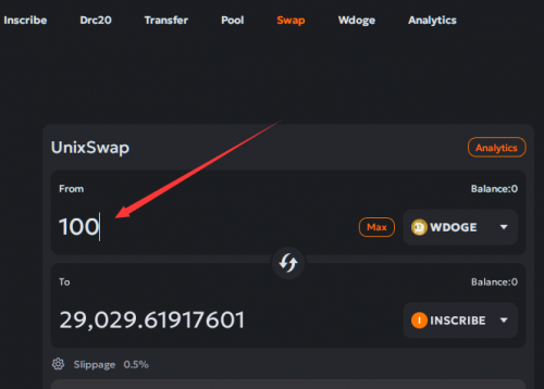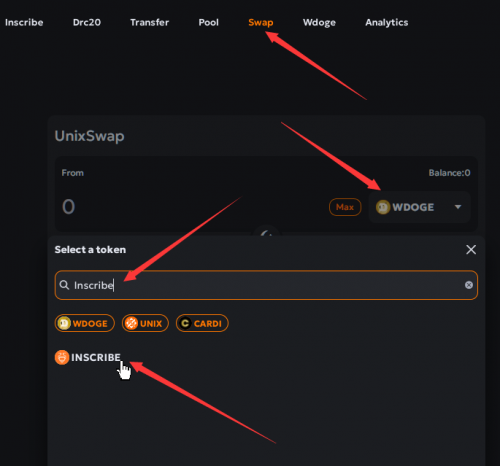 現(xiàn)在我們就可以使用Wdoge來(lái)兌換Inscribe,點(diǎn)擊網(wǎng)站上方菜單里的Swap,選擇使用Wdoge購(gòu)買,然后如下圖所示,搜索Inscribe,然后選中Inscribe
