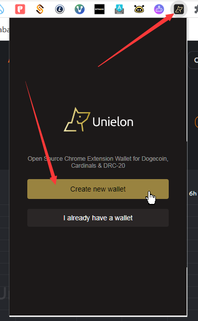 這時(shí)會(huì)彈出提示,要求你先安裝 Unielon Wallet 錢包,點(diǎn)擊 Install 進(jìn)入谷歌應(yīng)用商店,點(diǎn)擊“添加至 Chrome”,安裝谷歌插件。安裝完畢,點(diǎn)擊瀏覽器上的Unielon Wallet 錢包圖標(biāo),看下圖,是大家熟悉的谷歌插件錢包的初始界面,和常見(jiàn)的MetaMask小狐貍錢包大同小異,點(diǎn)擊Create new wallet 創(chuàng)建新錢包