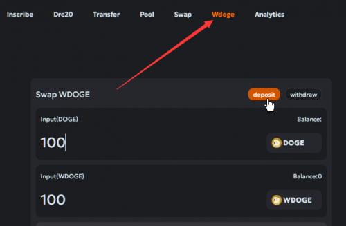 接下來(lái)點(diǎn)擊網(wǎng)站上方菜單里的Wdoge,如下圖所示,我們?cè)谶@里先要把Doge兌換成Wdoge,輸入要兌換的數(shù)量,依次點(diǎn)擊Swap — — Confirm — — Sign&Send,完成兌換