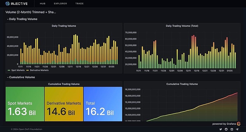 截至本文撰寫時 (2024 年 1 月),自主網(wǎng)上線至今的總體網(wǎng)絡(luò)交易量已經(jīng)突破 160 億美元。其中現(xiàn)貨市場交易量來到約 16 億美元,而衍生品市場交易量則高達(dá) 145 億美元,彰顯了用戶和機(jī)構(gòu)對 Injective 的喜愛。