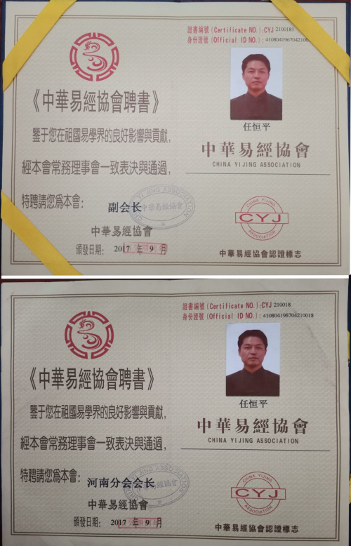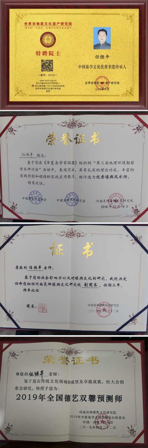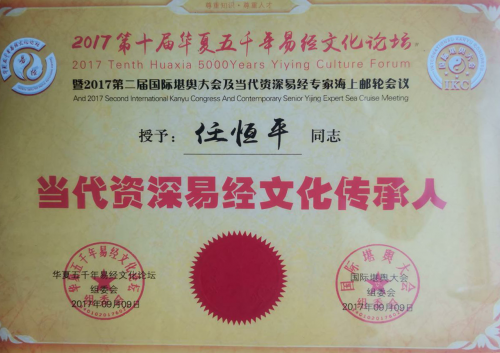 任恒平自1988年高校畢業(yè)參加政府工作后,在家傳易學(xué)文化基礎(chǔ)上,遍尋全國人杰圣地相繼拜訪名師高人,在持續(xù)頓悟中深入感念易經(jīng)文化的淵博和神奇,1997年開始全力于傳承學(xué)習(xí)和弘揚(yáng)國學(xué)傳統(tǒng)易經(jīng)文化,2007年8月經(jīng)授業(yè)恩師首肯授學(xué),2015年11月被中國易經(jīng)協(xié)會評為中國易經(jīng)當(dāng)代實(shí)力派命理風(fēng)水實(shí)戰(zhàn)專家和高級命理師,2017年3月創(chuàng)立河南道知易文化傳播有限公司,2017年9月被第十屆華夏五千年易經(jīng)文化論壇評為華夏五千年文化當(dāng)代資深易經(jīng)文化傳承人,同月?lián)沃腥A易經(jīng)協(xié)會副會長、河南省分會會長,2018年7月主辦中易協(xié)第二屆中國傳統(tǒng)文化正能量峰會,擔(dān)任組委會主 席,被大會授予中國易文化學(xué)術(shù)成就獎,2018年10月被河南省易經(jīng)研究會評為優(yōu)秀命理專家,并擔(dān)任河南省易經(jīng)研究會理事,2018年12月華夏易學(xué)家聯(lián)盟第三屆地理環(huán)境勘察學(xué)術(shù)研討會評委“優(yōu)秀堪輿師”,同月加入中國道教正一派,2019年4月被中原第二屆高峰論壇組委會評為“德藝雙馨”預(yù)測師,2019年1月受邀擔(dān)任河南昊坤堪輿文化研究院副院長,2023年10月受邀擔(dān)任河南國易生命科學(xué)研究院特聘科學(xué)優(yōu)生高級院士,2024年1月26日創(chuàng)立任恒平生命科學(xué)(福建)研究院,并擔(dān)任院長,2024年3月受邀擔(dān)任世界非物質(zhì)文化遺產(chǎn)研究院特聘院士。