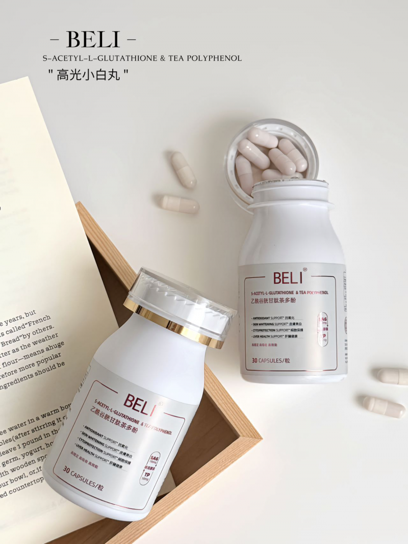 此外,國(guó)外也有研究文獻(xiàn)表明,傳統(tǒng)的谷胱甘肽因結(jié)構(gòu)脆弱,口服后分解率高達(dá)95%,最終僅微量抵達(dá)細(xì)胞。而BELI的乙酰谷胱甘肽(SAG)通過乙?;肿渔i與腸溶膠囊技術(shù),突破胃酸屏障,完整進(jìn)入細(xì)胞直擊黑色素生成鏈——抑制酪氨酸酶活性、清除自由基、阻斷氧化應(yīng)激,三重通路實(shí)現(xiàn)“根源抑黑”。復(fù)配茶多酚(TP)后,二者形成抗氧化雙引擎:TP不僅提升SAG穩(wěn)定性,更激活其代謝效能,讓美白效率呈幾何級(jí)增長(zhǎng)。這種“高穩(wěn)定吸收+靶向抑黑”的科技突破,將每一粒膠囊化為精準(zhǔn)的煥亮彈藥。