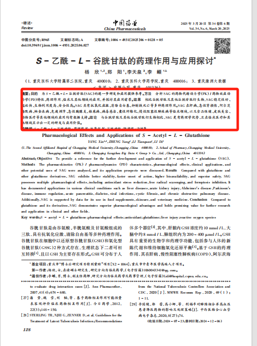 近日,發(fā)表在中國(guó)藥業(yè)的文獻(xiàn)研究《S-乙酰-L-谷胱甘肽的藥理作用與與應(yīng)用探討》,經(jīng)過分析SAG的藥物代謝動(dòng)力學(xué)(PK)/藥物效應(yīng)動(dòng)力學(xué)(PD)特性、藥理作用、臨床及其他領(lǐng)域的應(yīng)用,并探討其應(yīng)用前景。得出了一系列研究結(jié)果,結(jié)果表明:相比谷胱甘肽及其他谷胱甘肽行生物,SAG 穩(wěn)定性好起效快、生物利用度高、安全性高。SAG具有抗氧化應(yīng)激、清除自由基、抑制鐵死亡等多種藥理作用。SAG 在肝病、急性腎損傷、阿爾茨海默病、帕金森病、免疫調(diào)節(jié)、急性胰腺炎、糖尿病、病毒感染、囊性纖維化、慢性阻塞性肺疾病等臨床領(lǐng)域,以及食品保健、皮膚美容動(dòng)物醫(yī)療等其他領(lǐng)域的應(yīng)用均有數(shù)據(jù)支持。