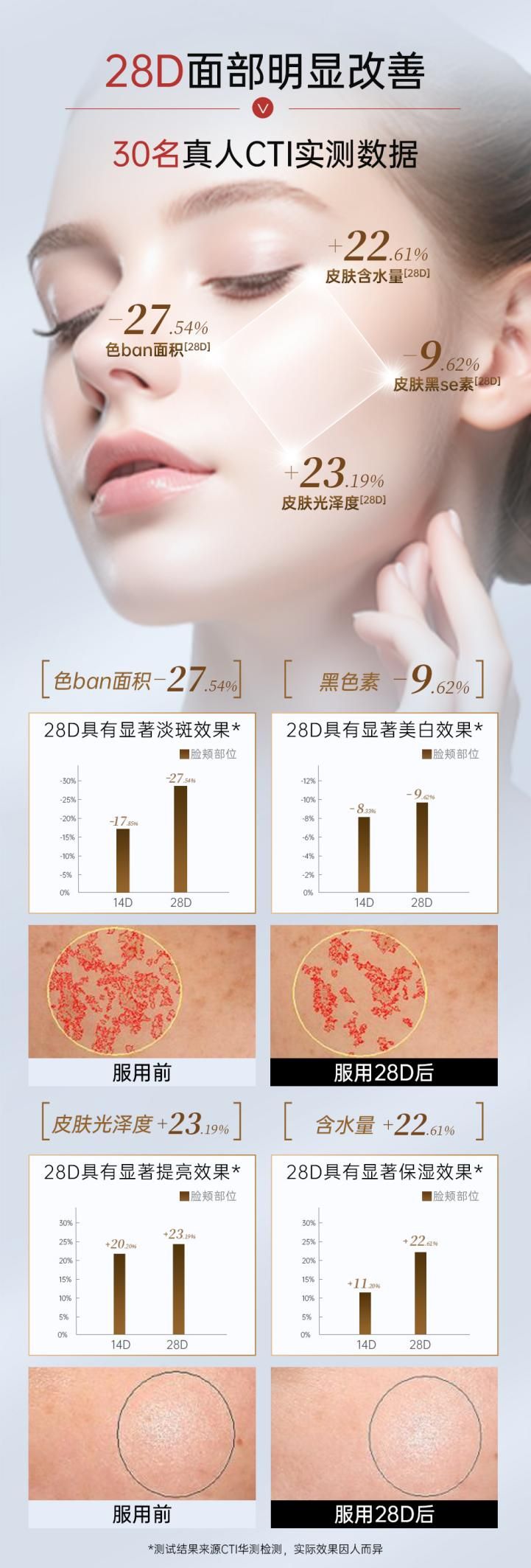 根據(jù)CTI華測(cè)28天的人體實(shí)驗(yàn)數(shù)據(jù)顯示,30名受試者服用后,黑色素MI值顯著下降9.62%,色斑面積縮減27.74%,96.67%的人表示,自己的膚色“透亮如高光打過”。此外,測(cè)試數(shù)據(jù)還顯示,受測(cè)著在實(shí)驗(yàn)結(jié)束后,皮膚水分含量平均飆升22.61%、光澤度躍升23.19%。眾多數(shù)據(jù),紛紛印證了“外防內(nèi)養(yǎng)”的科學(xué)閉環(huán)。實(shí)驗(yàn)中,零不良反應(yīng)的記錄,與小紅書用戶“三天褪黃氣”、“肌膚自帶柔焦感”的真實(shí)反饋相互印證,讓美白從玄學(xué)變?yōu)榭闪炕目茖W(xué)命題。