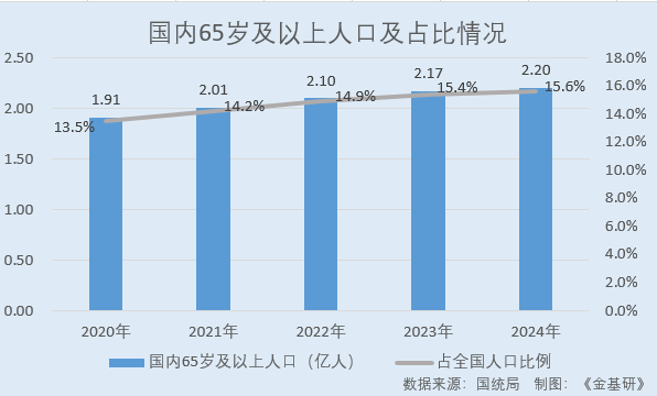 據(jù)國家統(tǒng)計局?jǐn)?shù)據(jù),2020-2024年,國內(nèi)65歲及以上人口分別為1.91億人、2.01億人、2.10億人、2.17億人、2.20億人,占當(dāng)年度全國人口的比例分別為13.5%、14.2%、14.9%、15.4%、15.6%。