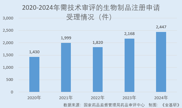 據(jù)國家藥監(jiān)局藥品審評中心發(fā)布的《2024年度藥品審評報告》,2020-2024年,國內(nèi)需技術(shù)審評的生物制品注冊申請數(shù)量分別為1,430件、1,999件、1,820件、2,168件、2,447件,近五年CAGR達14.37%。
