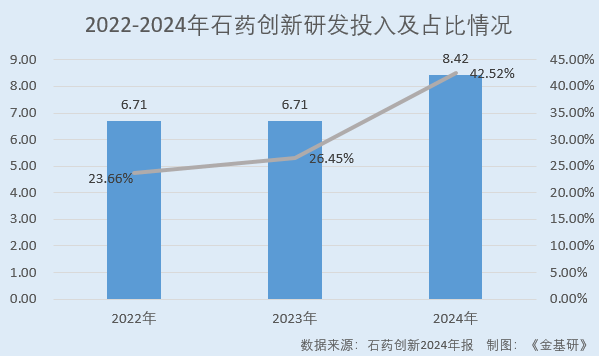 據(jù)石藥創(chuàng)新年報,2022-2024年,石藥創(chuàng)新研發(fā)投入分別為6.71億元、6.71億元、8.42億元,占當(dāng)期營業(yè)收入比例分別為23.66%、26.45%、42.52%。其中,2024年石藥創(chuàng)新研發(fā)投入同比增長25.44%。