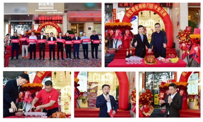 南稍門店的開業(yè)儀式在一片鑼鼓喧天中拉開帷幕。開業(yè)剪彩儀式由王偉彬先生、黃光新先生、羅毅先生、譚震先生、江軍煉先生、黃國慶先生、鄭卓生先生、姚漢銘先生、洪趙亮先生、林德洪先生執(zhí)金剪,于晨光中剪開鎏金彩帶,寓意著閱寶黃金南稍門店開啟輝煌前程。隨后,王偉彬先生和譚震先生主刀切金豬,三刀禮成間,鴻運、福氣、吉兆依次降臨。禮畢,杜炳承先生和佘紹川先生共注金色香檳,瓊漿流淌如鎏金河,象征財富生生不息。點睛環(huán)節(jié)邀請黃光新先生和羅毅先生執(zhí)朱筆為祥獅點睛,朱砂點睛后,祥獅騰躍采青、繞柜巡游,為黃金柜臺披金掛彩,引發(fā)現(xiàn)場觀眾陣陣喝彩。