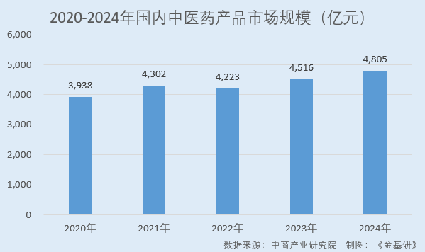 據(jù)中商產(chǎn)業(yè)研究院數(shù)據(jù),2020-2024年,國內(nèi)中醫(yī)藥產(chǎn)品市場規(guī)模分別為3,938億元、4,302億元、4,223億元、4,516億元、4,805億元,年均復(fù)合增長率為5.10%。中商產(chǎn)業(yè)研究院預(yù)計(jì),2025年國內(nèi)中醫(yī)藥產(chǎn)品市場規(guī)模將達(dá)到5,061億元。