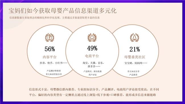 ? 查得全:56% 靠母嬰社區(qū)(寶寶樹(shù)、媽媽網(wǎng))學(xué)知識(shí),52% 靠?jī)?nèi)容平臺(tái)(抖音、小紅書(shū))種草,21% 靠電商平臺(tái)(淘寶、京東)看評(píng)論,單一渠道抓不住;