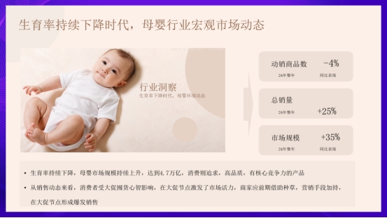 ? 盡管生育率平緩,市場(chǎng)規(guī)模仍以 35% 同比增長(zhǎng),核心是 “精致育兒” 推高客單價(jià) —— 家長(zhǎng)愿為 “安全奶粉”“抗菌紙尿褲” 等高品質(zhì)產(chǎn)品多花錢;