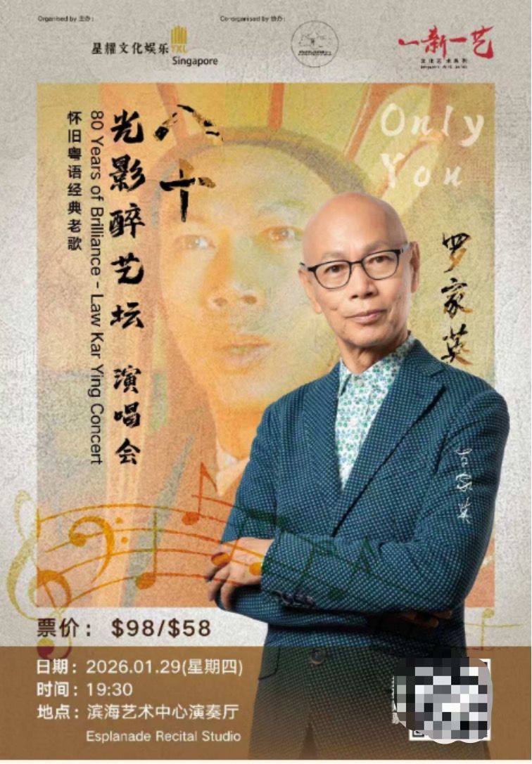 近日,新加坡星耀文娛傳媒宣布攜手新加坡中國(guó)白酒有限公司、新加坡吉藝文化,共同舉辦“80 Years of Brilliance - Law Kar Ying Concert”羅家英新加坡演唱會(huì)。此次演唱會(huì)作為“一新一藝”文化藝術(shù)系列活動(dòng)之一,將于2026年1月29日19:30在濱海藝術(shù)中心演奏廳(Esplanade Recital Studio)開(kāi)唱,目前門(mén)票已正式開(kāi)售,80歲高齡的羅家英將攜經(jīng)典曲目登臺(tái),為獅城觀眾帶來(lái)一場(chǎng)融合粵語(yǔ)老歌與傳統(tǒng)粵劇的視聽(tīng)盛宴。